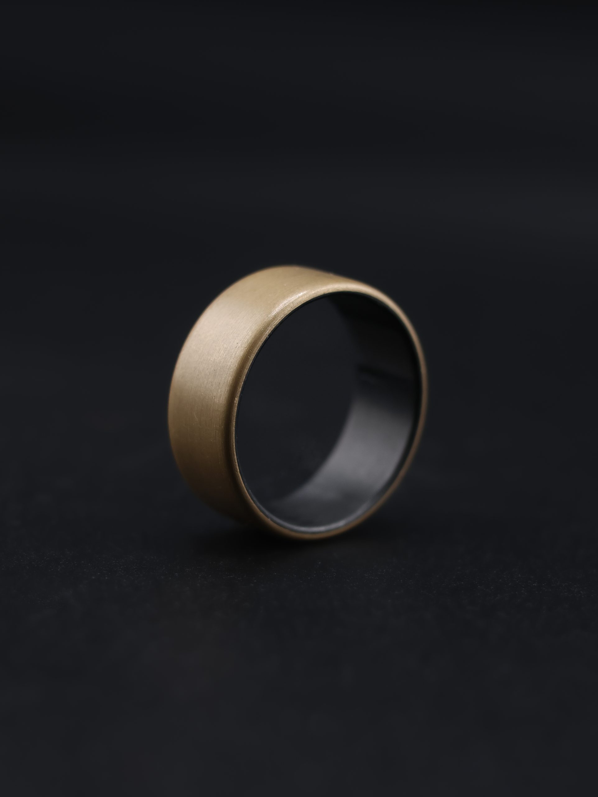 A black carbon fibre liner sits inside the ring, adding strength and a striking contrast against the bronze. Combined with a flat profile, the carbon fibre reinforces the structure while keeping the ring lightweight and modern in feel. The result is a durable, maintenance-free men’s wedding ring with a distinctive look that stands apart from traditional designs