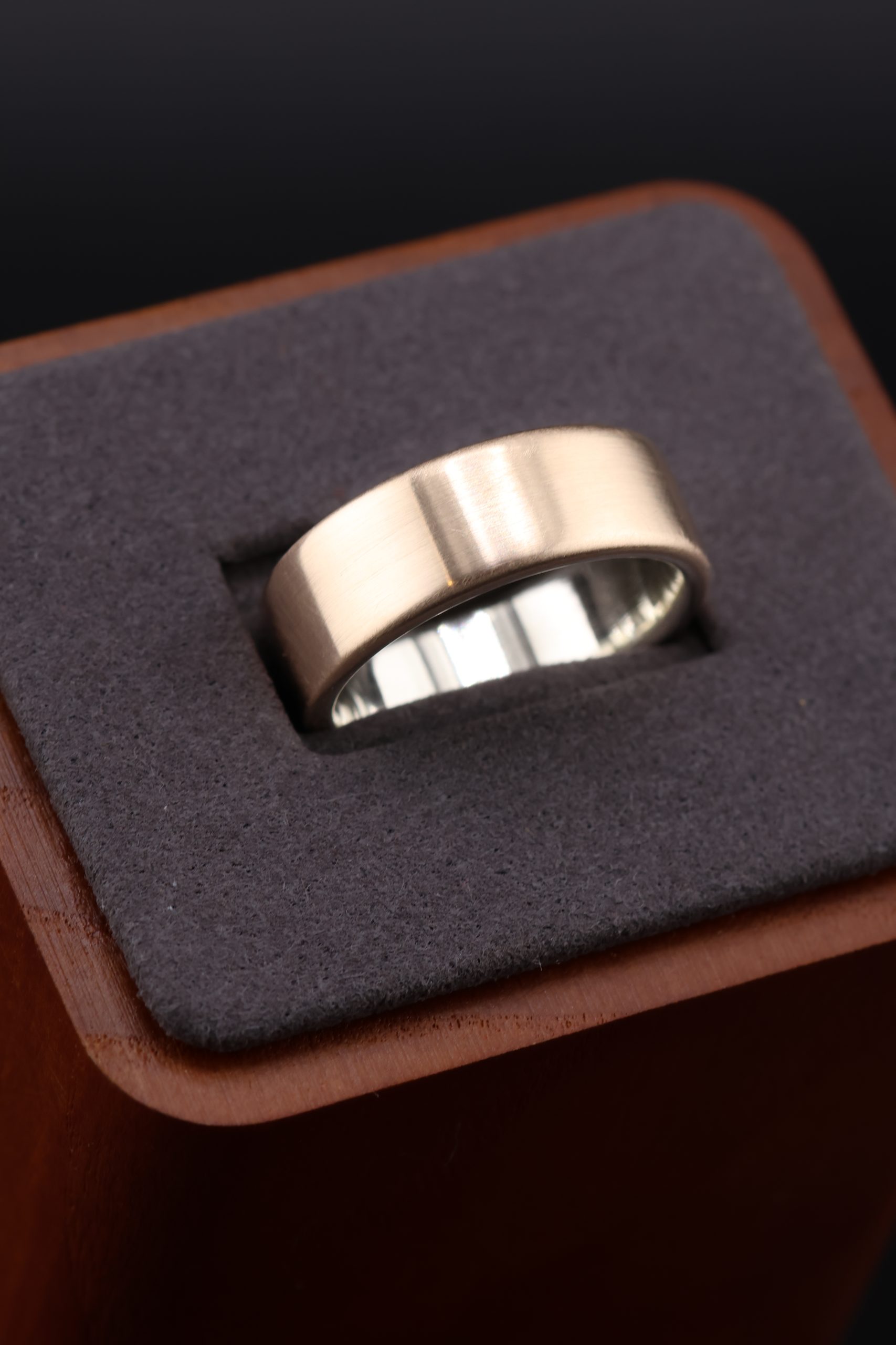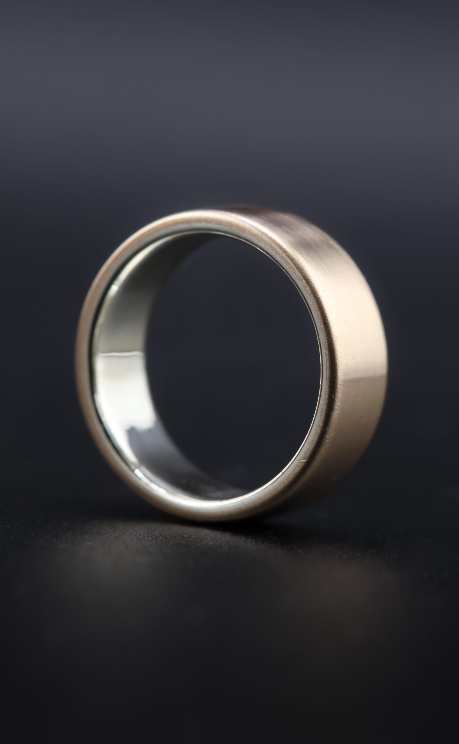 This bronze ring with a sterling silver liner is a strong and distinctive choice for a wedding ring. Made at 7mm wide with a flat profile, it has a solid weight and a smooth feel on the hand. The polished bronze exterior contrasts with the bright sterling silver liner, giving the ring a refined, modern look that stands out without being overdone.