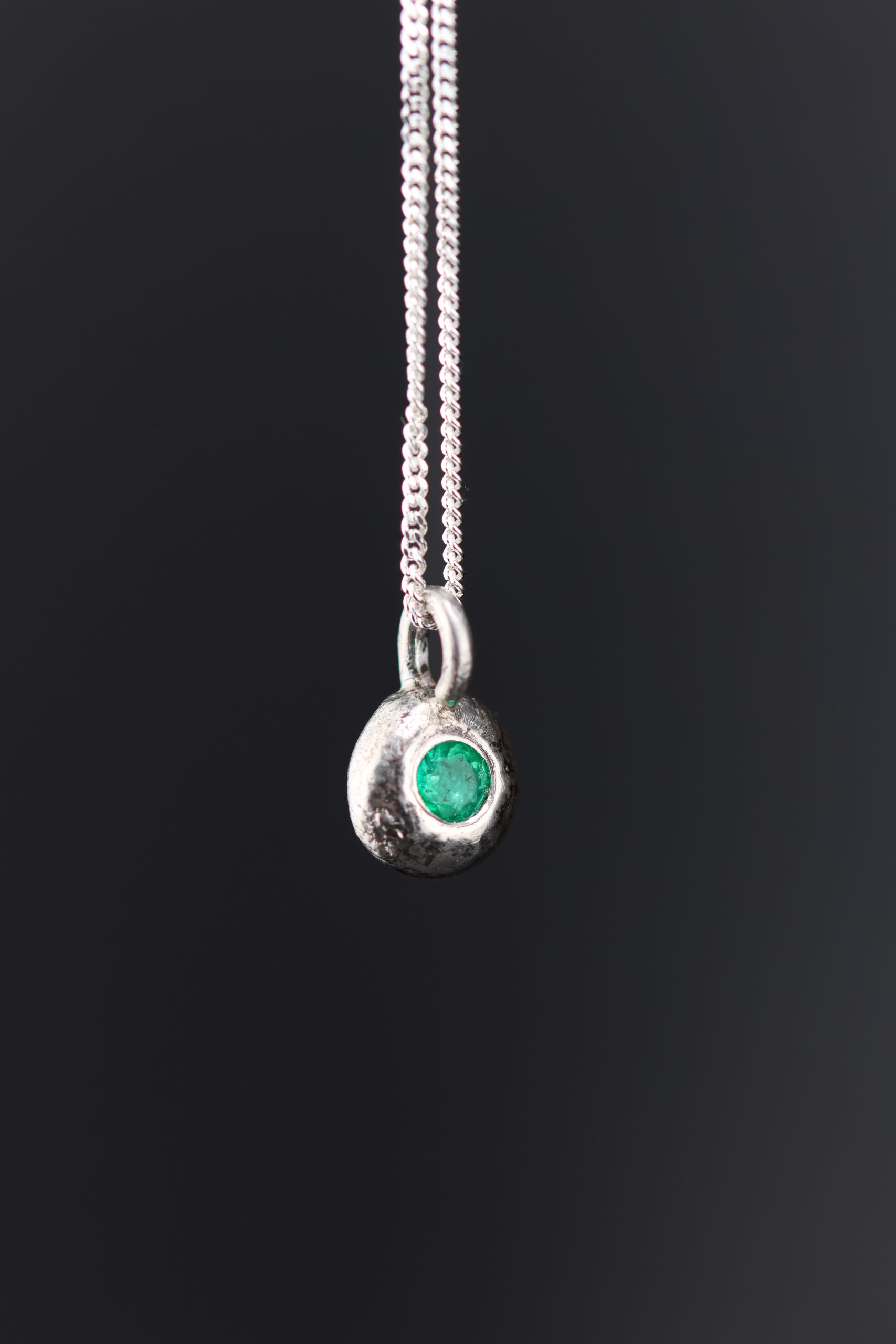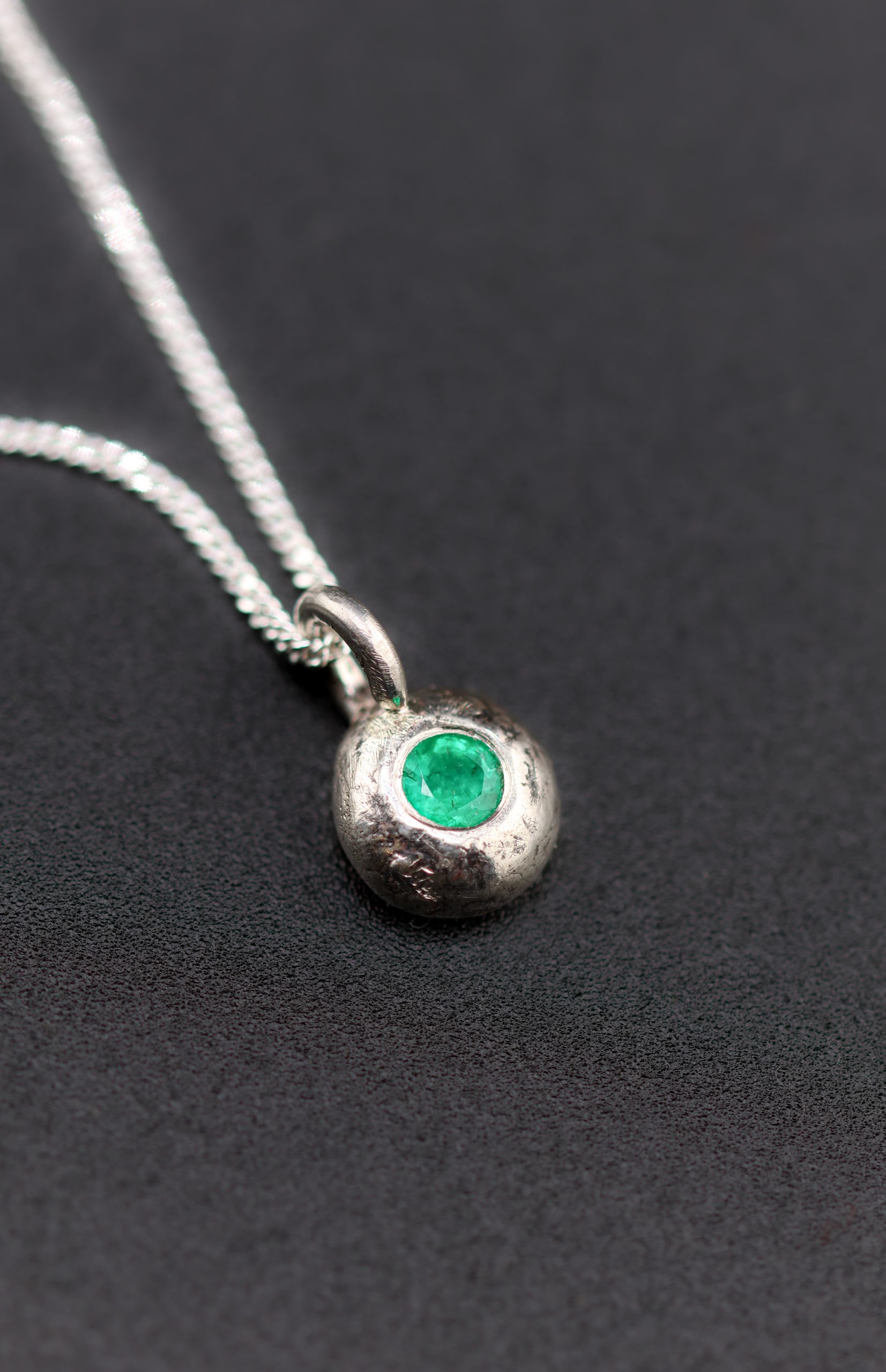 This emerald green pendant necklace is handcrafted in sterling silver. We use a traditional sand casting process, therefore it creates an organic, one-of-a-kind surface texture. At the centre, a flush set green emerald sits securely within the silver, giving a clean and durable finish. The pendant hangs from an 18-inch sterling silver chain, allowing it to sit neatly at the neckline. As a result, this necklace feels distinctive and individual, with no two pieces ever exactly the same