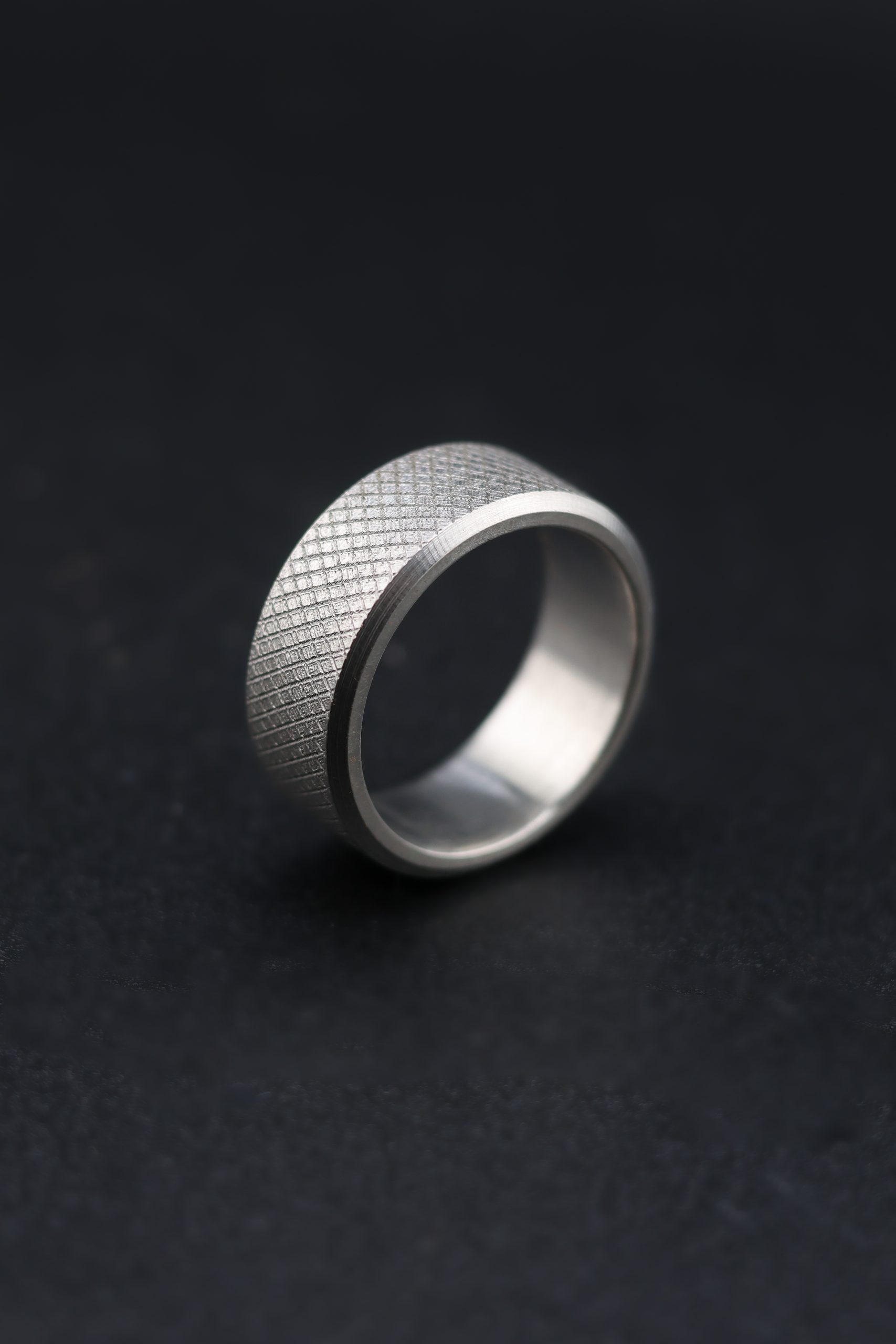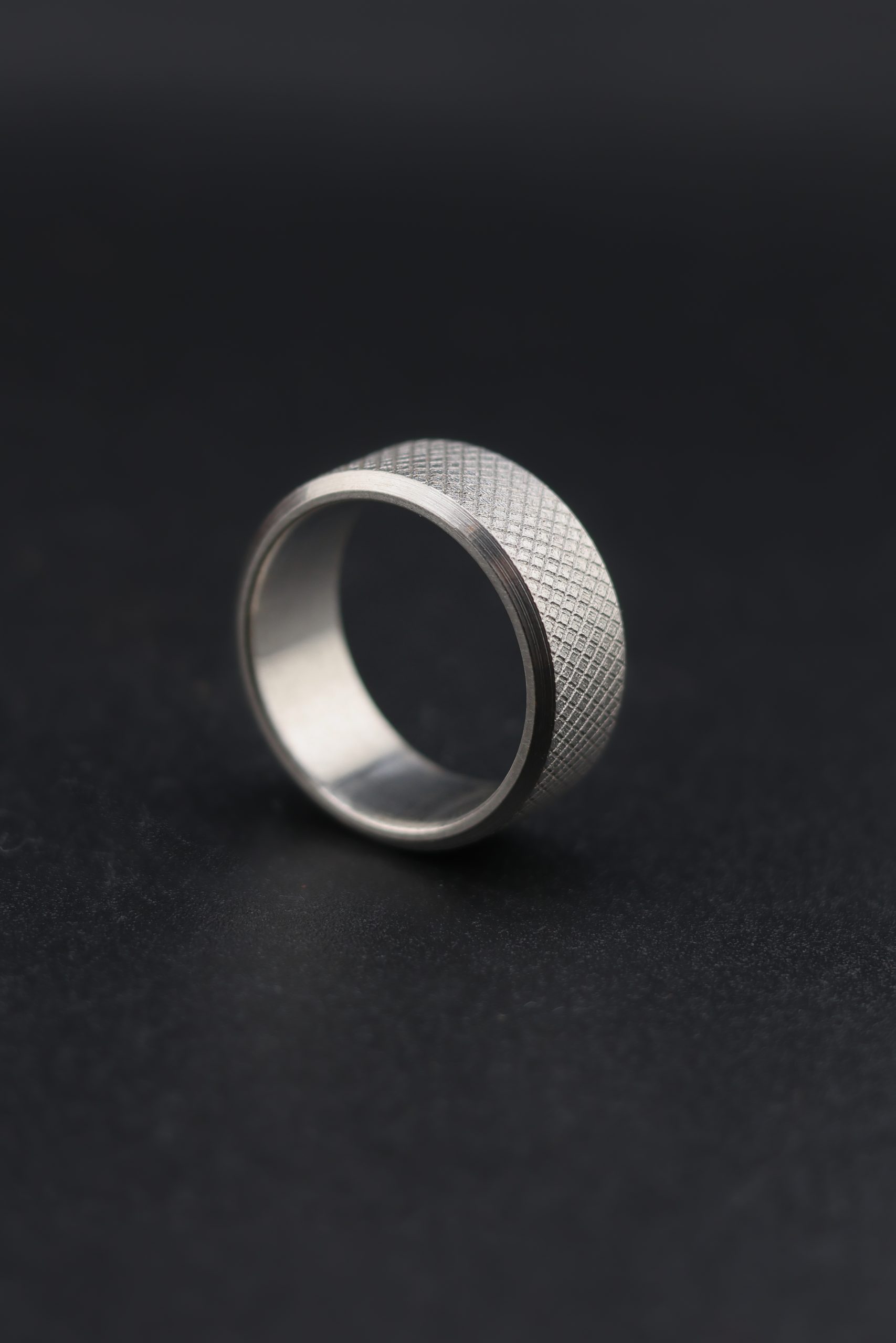 This knurled titanium wedding ring is handmade by award-winning goldsmith James French.