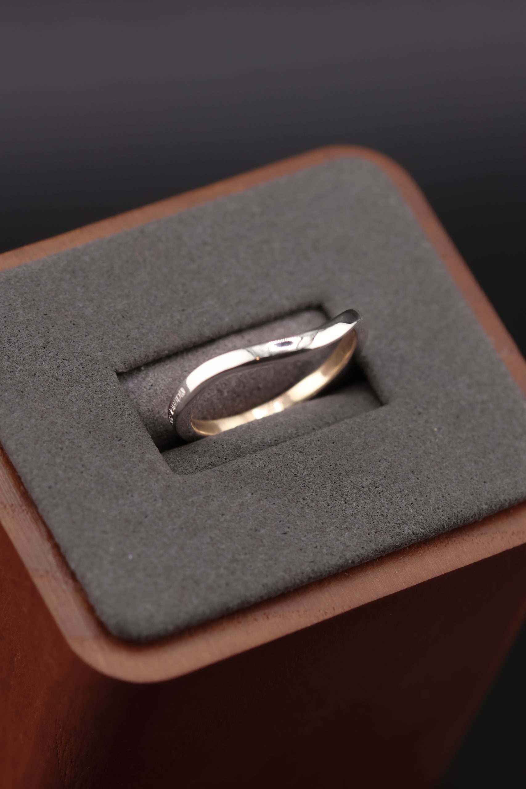 This shaped wedding ring with bronze liner is designed to sit neatly alongside an engagement ring, creating a close and considered fit. The slim 2.0mm width and flat profile keep the outer design clean and refined, while the bronze liner adds warmth and contrast on the inside of the ring.