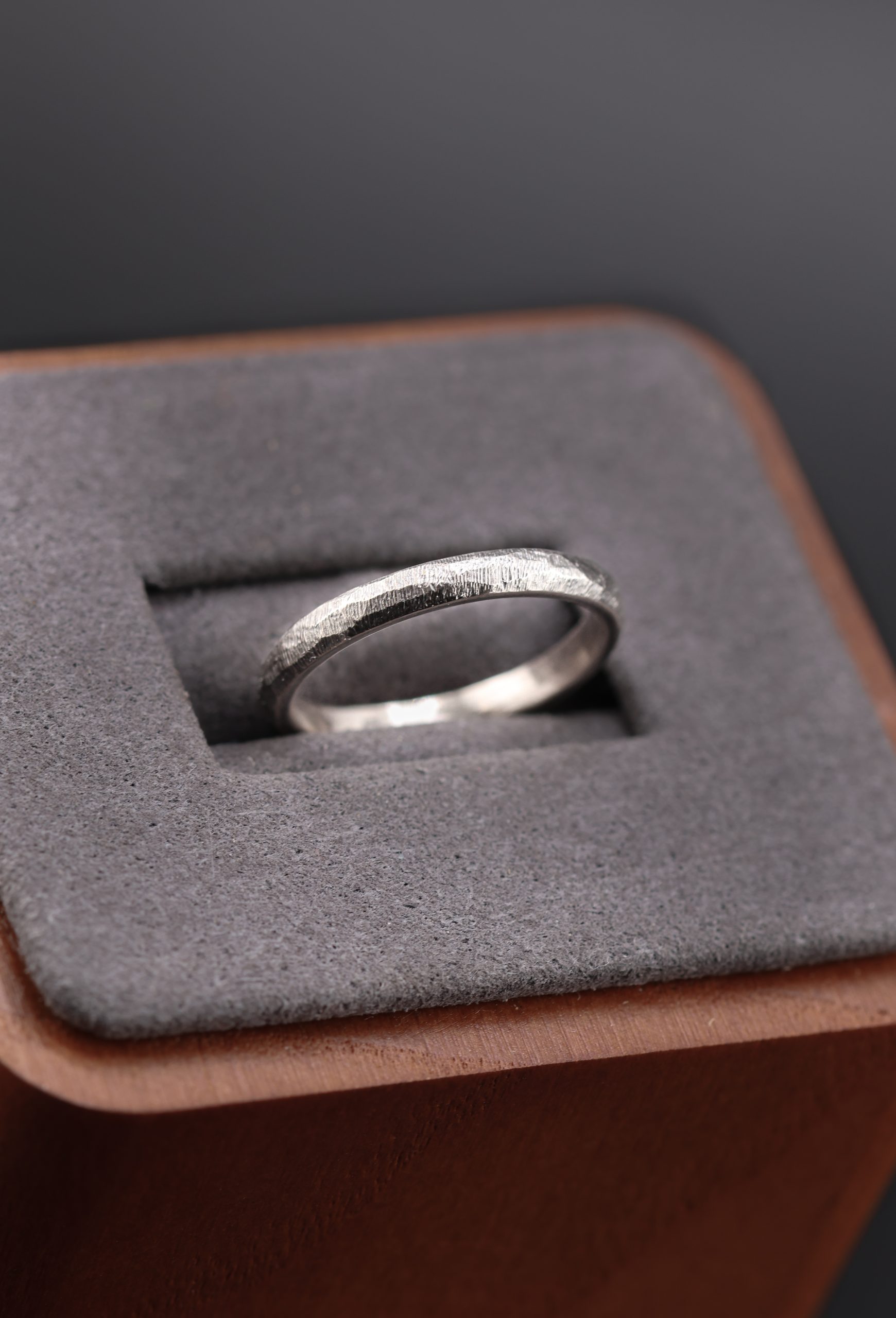This slim sand cast wedding ring offers an organic take on a classic design, shaped with a traditional D-shaped profile for a comfortable, easy fit. With a 3.5mm width, the ring keeps a refined, minimal appearance while still showing the natural character of the material.