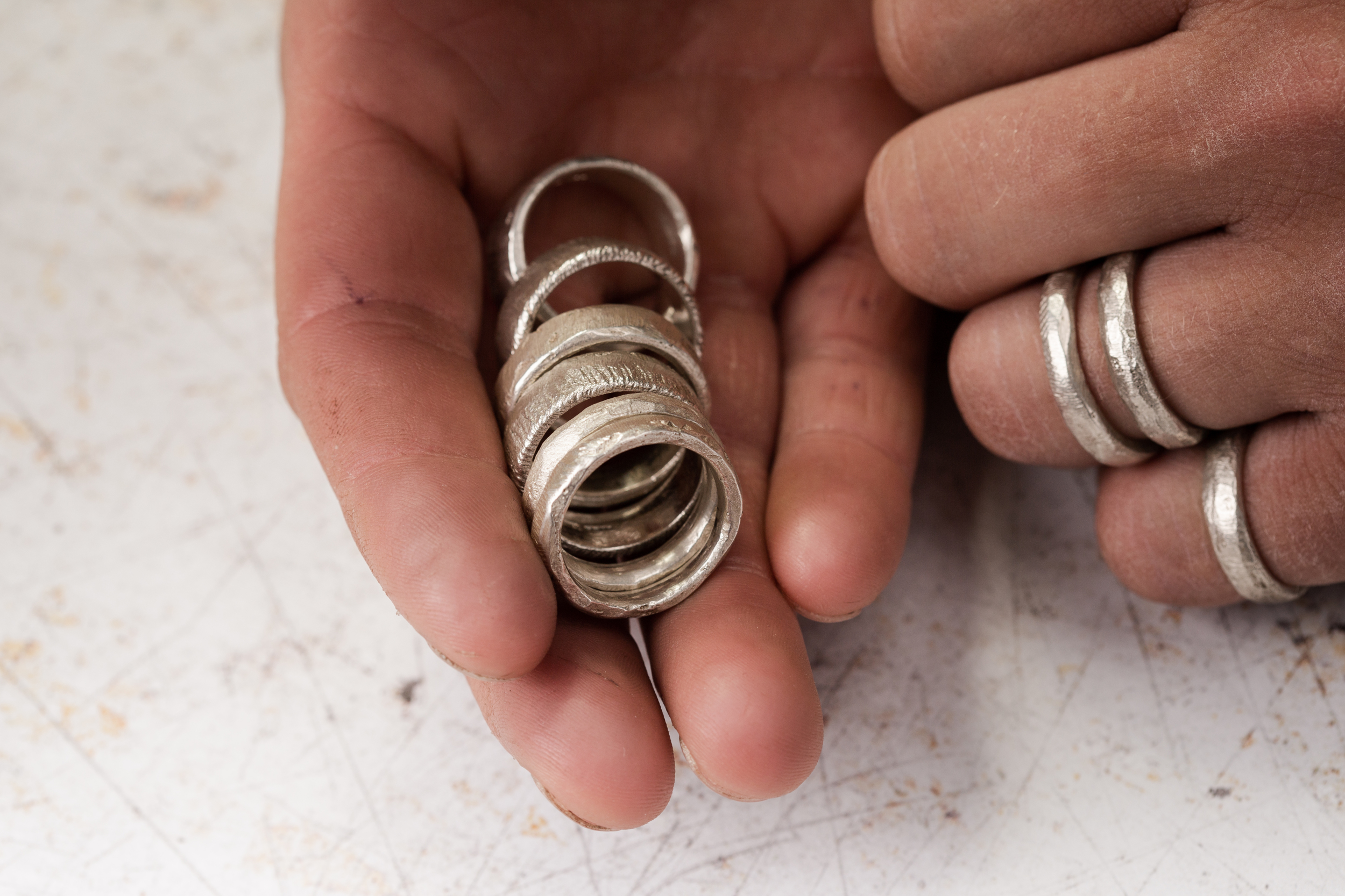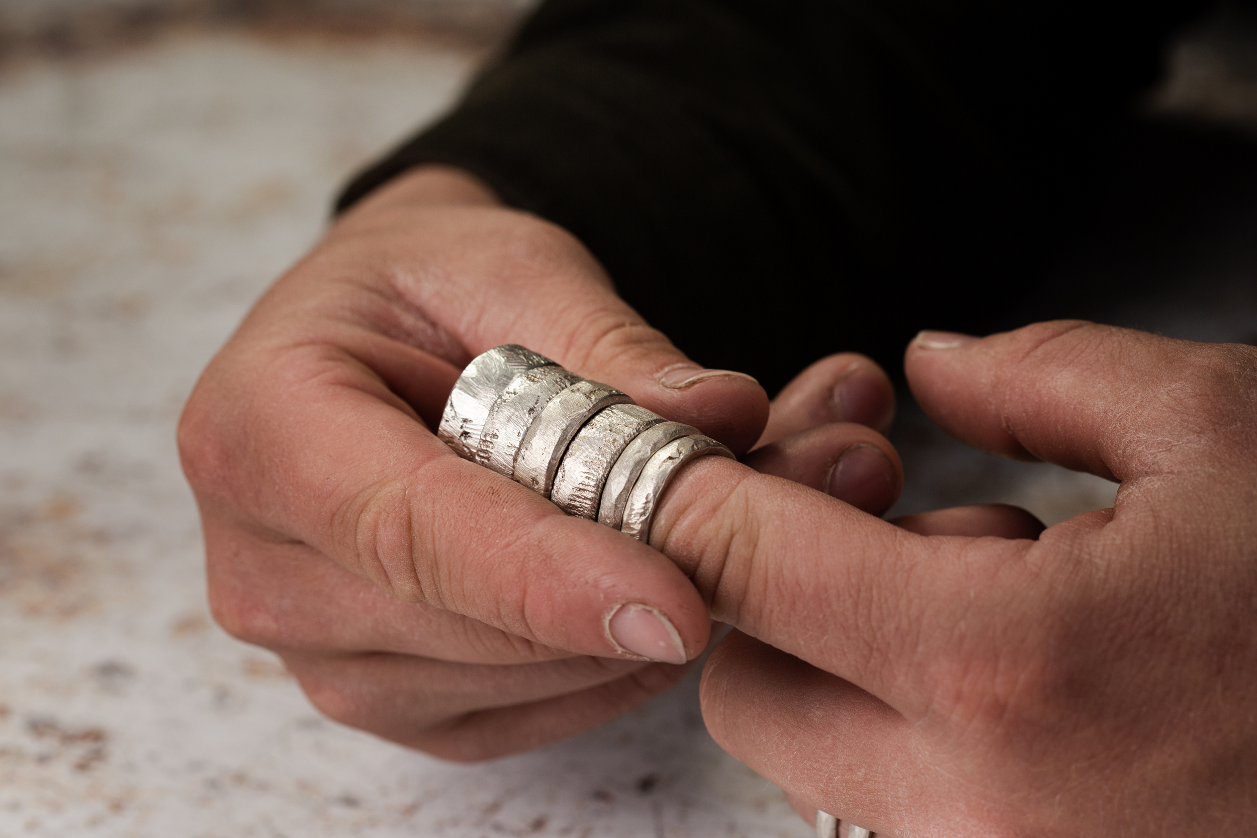 The surface texture is formed naturally during the sand casting process, meaning no two rings are ever the same. Rather than a uniform finish, the ring displays subtle depth and variation across the surface, giving each band its own distinct look. Handmade to order in Devon, UK, this wedding ring is available in sterling silver, white gold, or platinum.